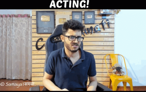 Ajey Nagar (Carryminati) sits in a gaming chair, wearing glasses, in front of a wall with 'ACTING!' written on it.