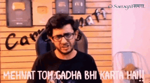 Carryminati (Ajey Nagar) delivers a powerful Hindi dialogue about hard work, stating 'Even a donkey works hard!'