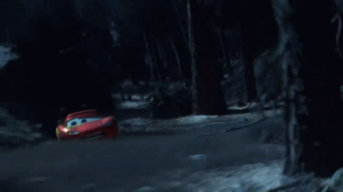 Lightning McQueen from the Cars movie franchise drives off-road through a dark forest at night.