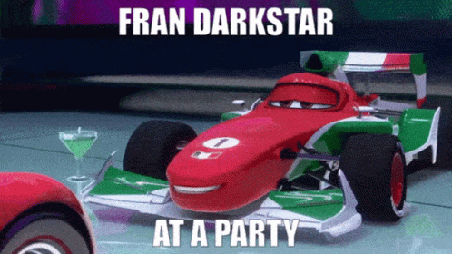 Fran Darkstar, the race car from Cars 2, appears to be at a party, with a martini glass nearby.