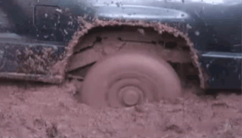 A dark-colored car is completely stuck in thick, reddish-brown mud, with its wheel submerged.
