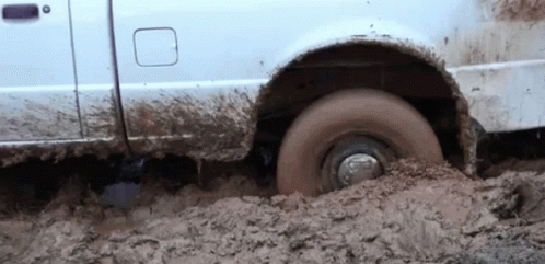 A white pickup truck is deeply stuck in thick, brown mud, with its rear wheel spinning and covered in dirt.