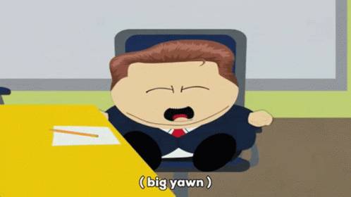 Cartman from South Park yawns dramatically, exclaiming 'Oh God, I just got so sleepy' and asking 'What were you talking about?'