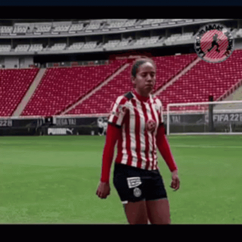 Casandra Montero de Chivas Femenil en el campo de fútbol, mostrando su espíritu rojiblanco en el estadio.