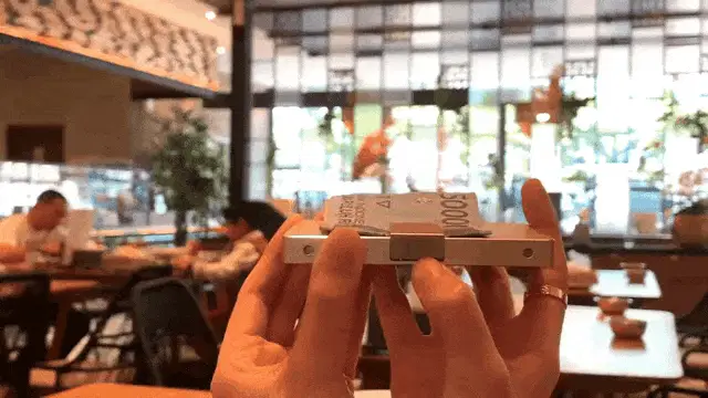 A stylish woman in a hat and blazer exits a luxury car, walks up steps, and uses her Cascade Wallet to access a building.