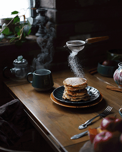 Powdered sugar being sifted over a stack of pancakes, served with a steaming cup of tea for a cozy breakfast.