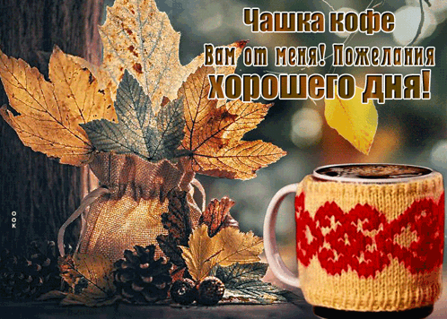 An autumn-themed greeting with a cup of coffee and leaves, wishing a good day.