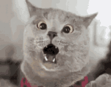 A close-up of a grey cat with wide eyes and an open mouth, looking surprised, often used as a meme.