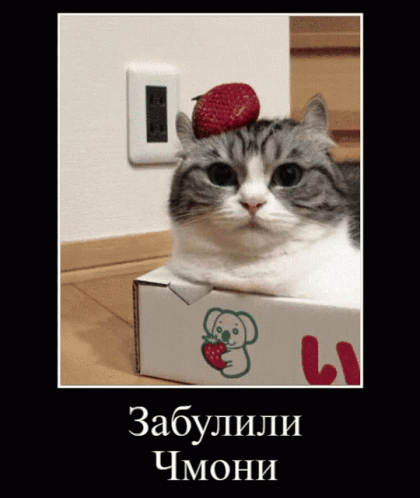 Komaru the cat sits in a box with a strawberry on its head, looking adorable and slightly 'bullied'.