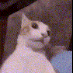 A white and orange cat looks surprised, followed by a meme-style explosion effect.