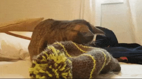 A tabby cat gets its head stuck in a grey and yellow woolly hat, resulting in a hilariously grumpy expression.