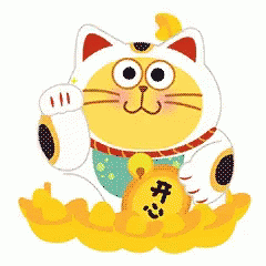 A cheerful Maneki-neko, or lucky cat, waves its paw, holding a bag with the Chinese character for 'happy'.