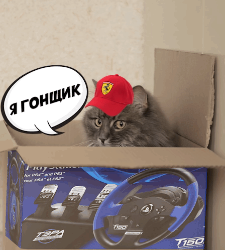 A funny cat wearing a red Ferrari hat sits in a cardboard box, declaring 'I am a racer' in Russian.