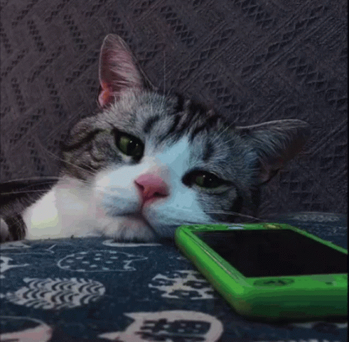 A sad-looking cat rests its head next to a bright green phone on a patterned blanket.