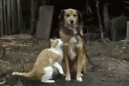An orange and white cat stands on its hind legs to snuggle with a seated brown dog outdoors.