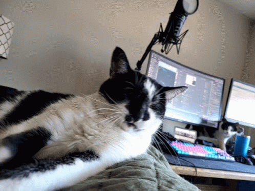 A black and white cat meticulously grooms itself, licking its paw while relaxing near a computer setup.