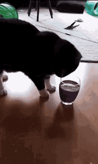 A black cat with 'happy feet' enthusiastically drinks from a glass, showing its thirst.