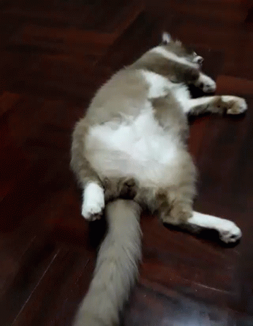 A fluffy cat is lying on its back on a wooden floor, exposing its belly and long tail.
