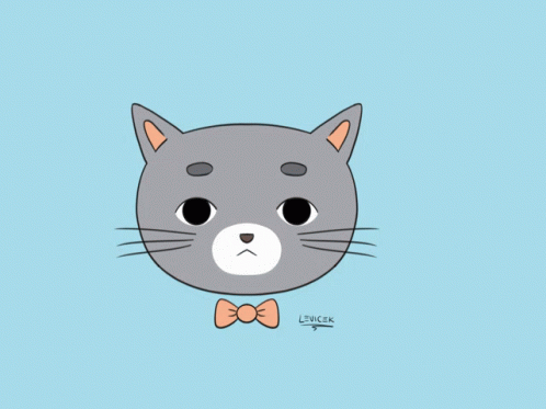 A cute cartoon grey cat with a raised eyebrow and a peach bow tie, looking concerned.