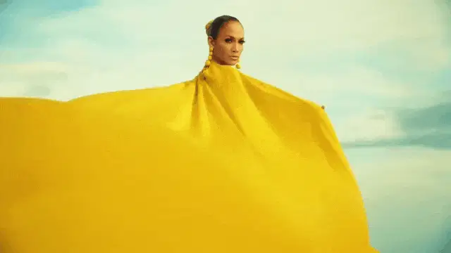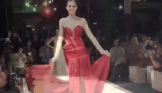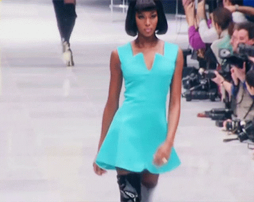 Supermodel Naomi Campbell struts down the runway in a vibrant blue dress at a fashion show.