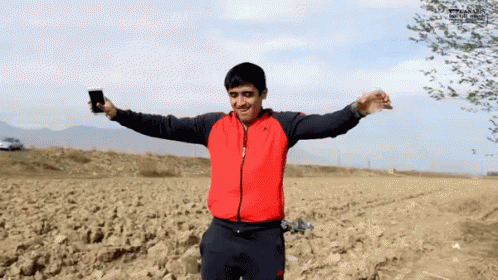 A man in a red and black jacket happily dances in a plowed field, exclaiming "I am awesome!" with a cell phone in hand.