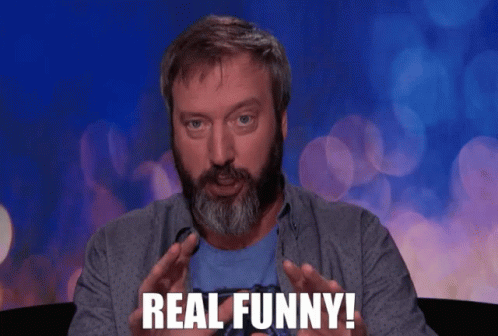 Tom Green sarcastically says 'Real Funny!' with a hand gesture against a blue background.