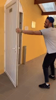 Lucas, wearing a blue hat and white shirt, struggles to open a white door in a yellow hallway.