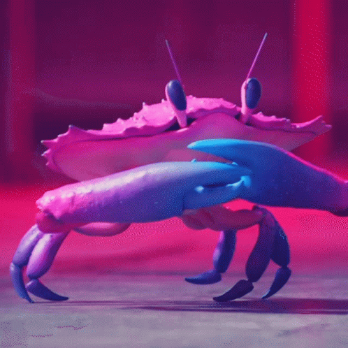 A vibrant pink and blue animated crab stands on a pink surface, its claws poised as if ready to fight.