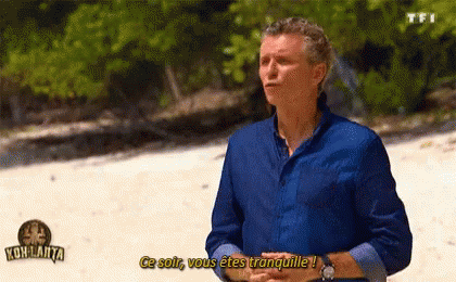 A man from Koh-Lanta on a beach, gesturing while saying, 'Ce soir, vous êtes tranquille!'