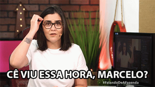 Woman in glasses asks 'Cê Viu Essa Hora, Marcelo?' at a desk, discussing gossip.