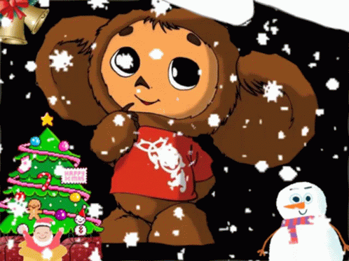 Cheburashka in a red shirt celebrating Christmas with falling snow, a decorated tree, and a snowman.