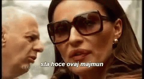 Ceca Ražnatović, wearing sunglasses, reacts with the Serbian caption "šta hoće ovaj majmun" (what does this monkey want).