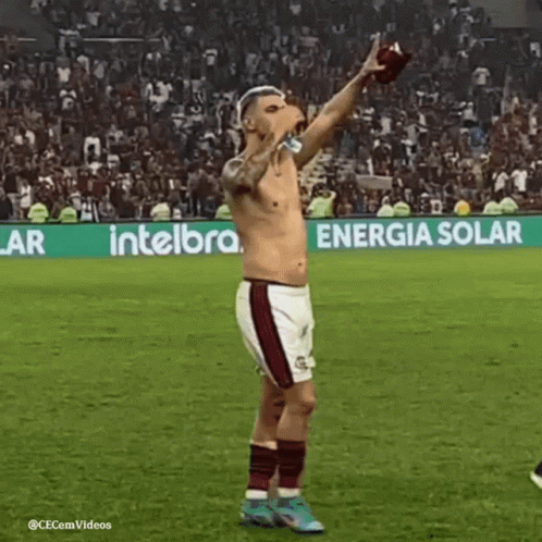 Arrascaeta, a shirtless soccer player, celebrates on the field after a match, captured by Cecemvideos.