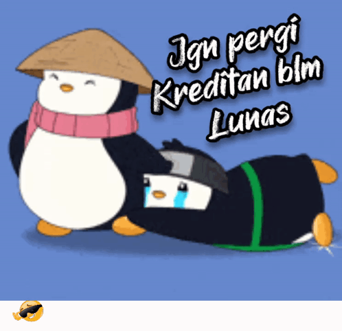 A penguin in a straw hat stops another crying penguin, reminding them about unpaid credit.