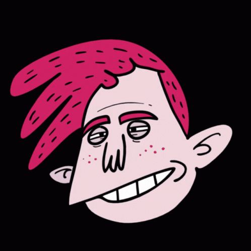 Cartoon face with pink hair, raising an eyebrow and smiling.