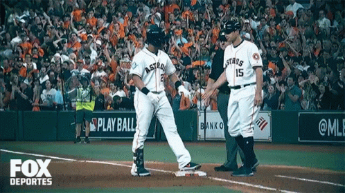 Houston Astros players, including Michael Brantley, celebrate on the field during a baseball game.