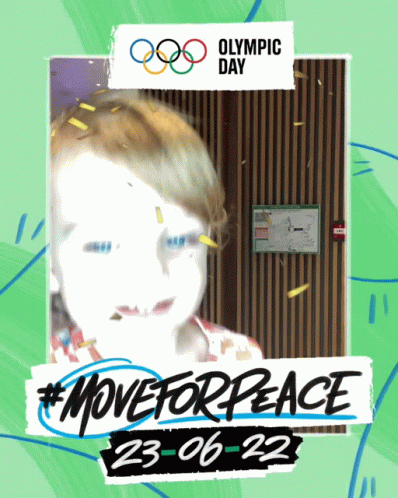 A child joyfully celebrates Olympic Day with falling confetti, promoting the #MoveForPeace initiative.