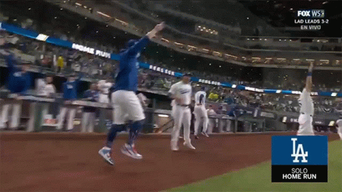 Los Angeles Dodgers celebrating a World Series victory with cheers and high-fives after a Mookie Betts home run.