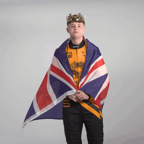 A man in a McLaren Formula E suit and crown celebrates with a Union Jack flag.