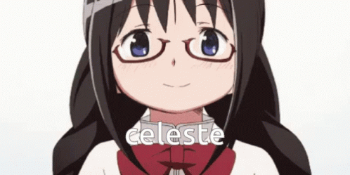 Homura Akemi from Madoka Magica, wearing glasses, with 'celeste' on her neck, referencing the Celescody pairing.