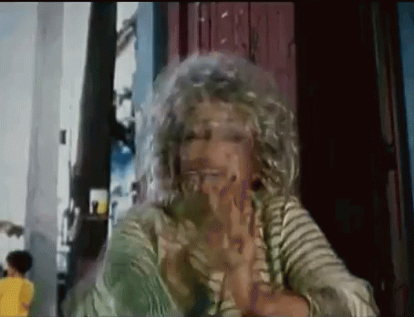 Celia Cruz, the Queen of Salsa, makes a gesture related to money, wearing a distinctive wig and striped shirt.