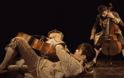 Dynamic cello performance by 2Cellos Evchu, with one musician playing on the floor.