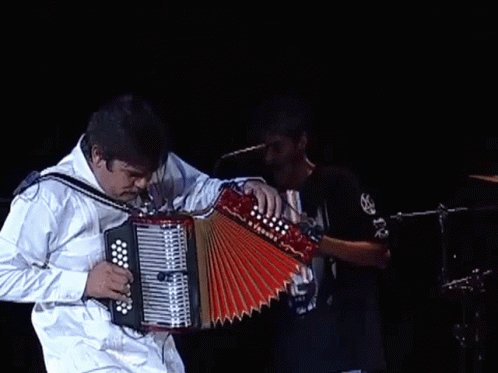 Mexican musician Celso Piña performs live on stage, passionately playing his red accordion.