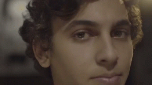 A young man with curly hair winks playfully at the camera in a dimly lit setting.