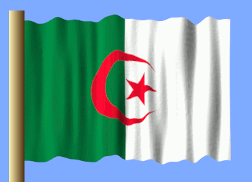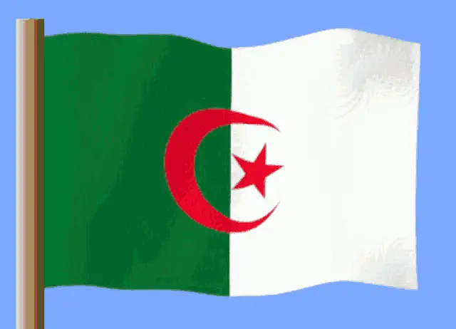 The national flag of Algeria, featuring green and white stripes with a red crescent and star, waves proudly.