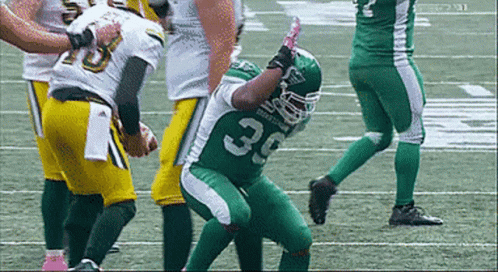 A Canadian Football League player in a green jersey with number 30 makes a silly pose on the field.