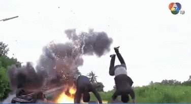 Intense explosion scene from Ch7drama สารวัตรใหญ่, featuring a man doing a handstand amidst the blast.
