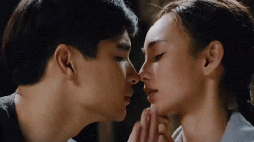Mike Pattaradet and Now Tisanart share a tender nose kiss in a romantic scene from Ch7drama's Duang Jai Khobot.