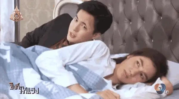 A woman in a pink tank top makes a series of expressive, annoyed, and surprised faces in a Thai drama scene.