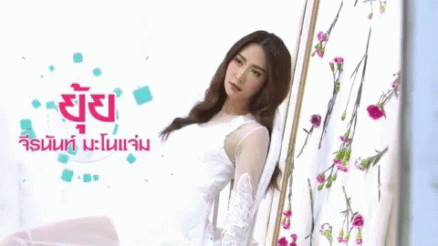 Yui Jiranun Manochaem in a white dress, posing elegantly for Ch7drama, surrounded by floral decor.